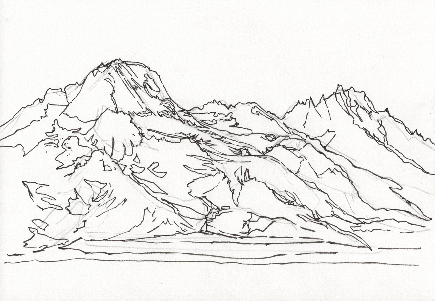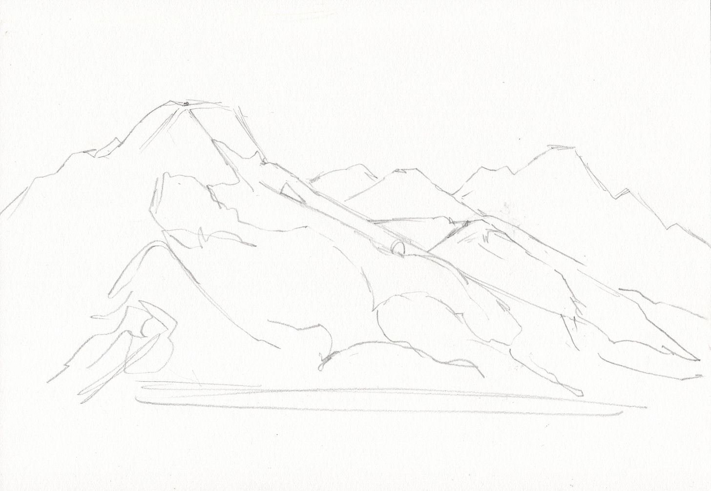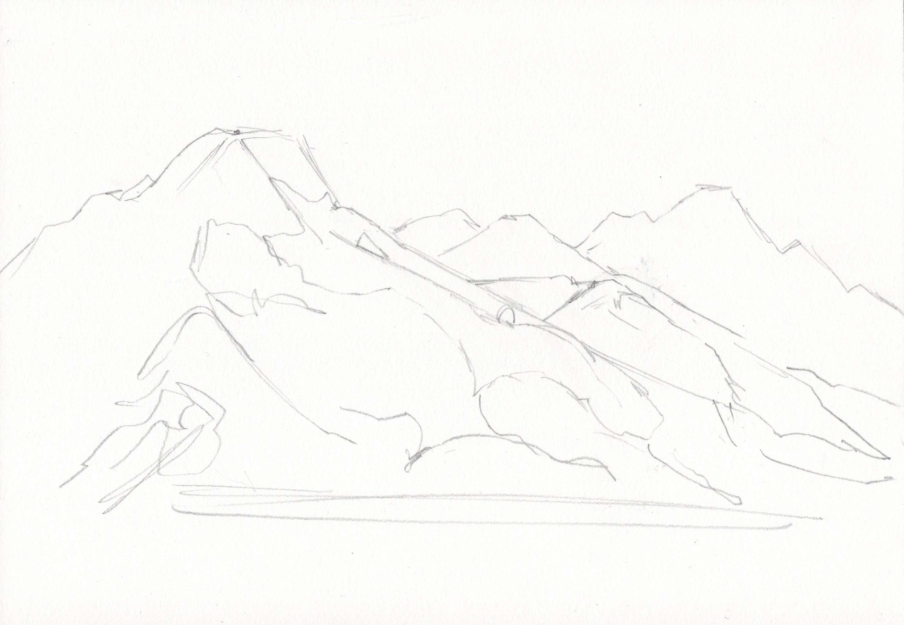 Once I think things through I begin with a rough pencil sketch. I use my pencil as a tool to measure angles and proportions. Instead of focusing on the tiny details I draw a straight line for the general shape of the ridge, and then I can add the little notches (and gendarmes) later.
