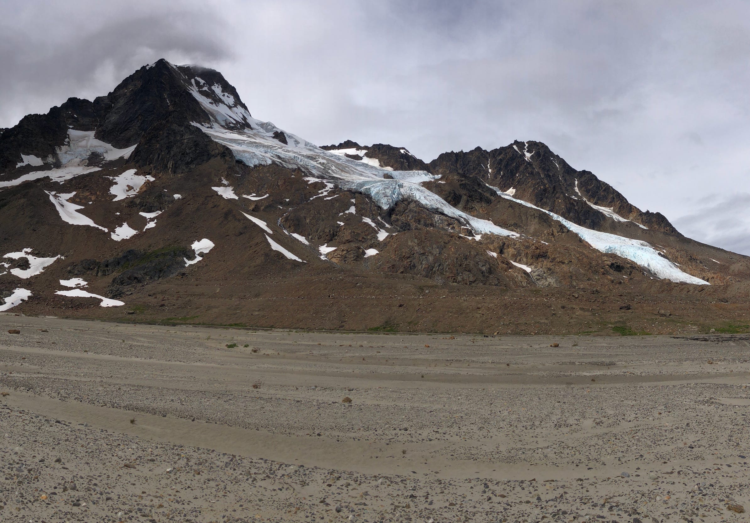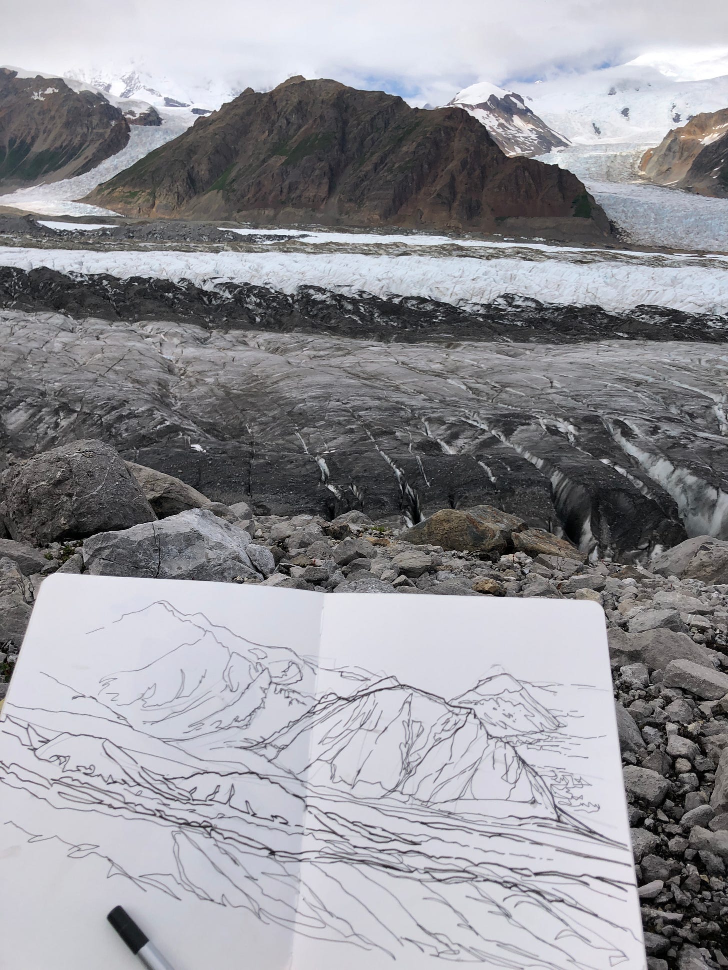 The place: These peaks hold some receding hanging glaciers that feed some beautiful alpine lakes right by the airstrip in the Chugach Mountains called “Iceberg Lake”. There used to be a big lake here dammed by a glacier. You can see the horizontal lines where the old lakeshore is in the middle of the photo. This picture is taken from the airstrip while waiting for our flight home. I thought I would get to make a sketch here, but it was pretty windy and cold, so I didn’t end up doing that and it was nice to step back into that memory now.
