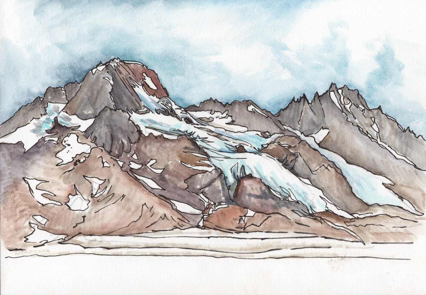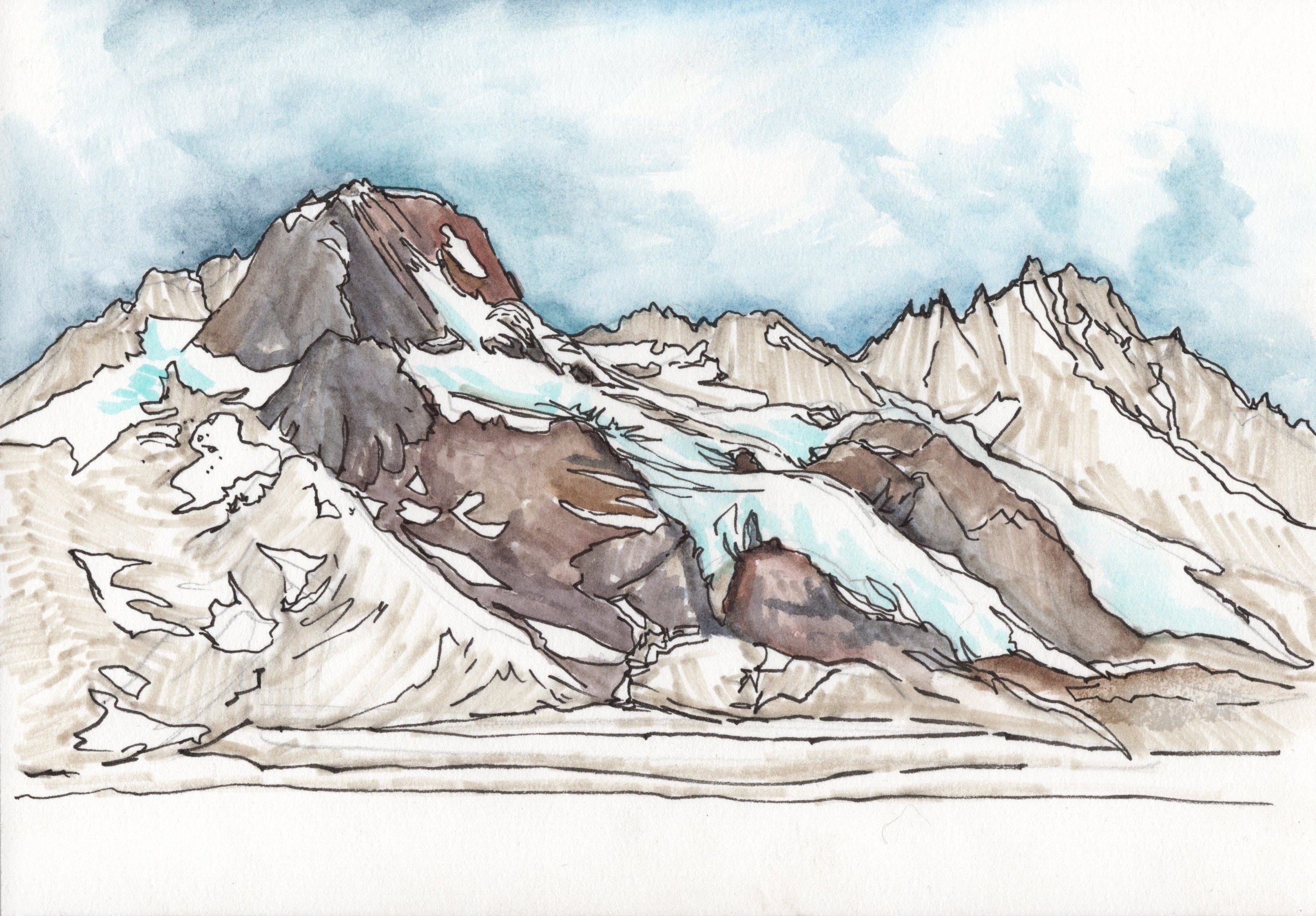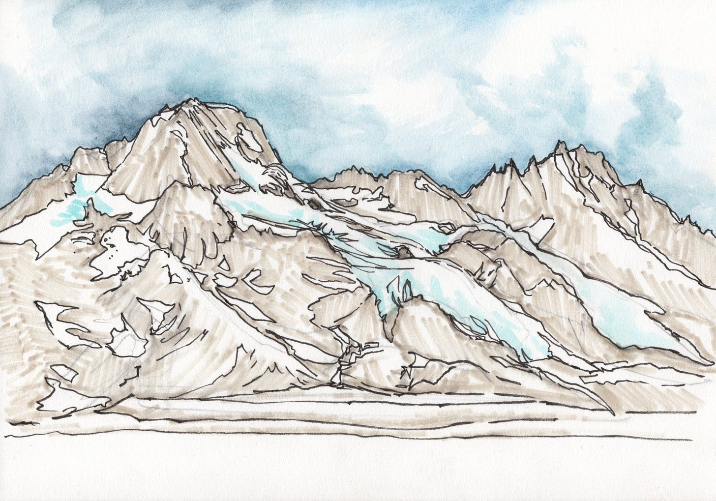 Now I get to add watercolor! I usually start with the sky since it is the farthest away and because it helps to situate the mountains in the world. Then I added a bit of blue in the glacier ice. I work light to dark and want to keep the whites in the snow and the ice so they reflect the white of the paper and sparkle in the finished sketch. I often finish a sketch here, sometimes with just the lines and the sky painted in.