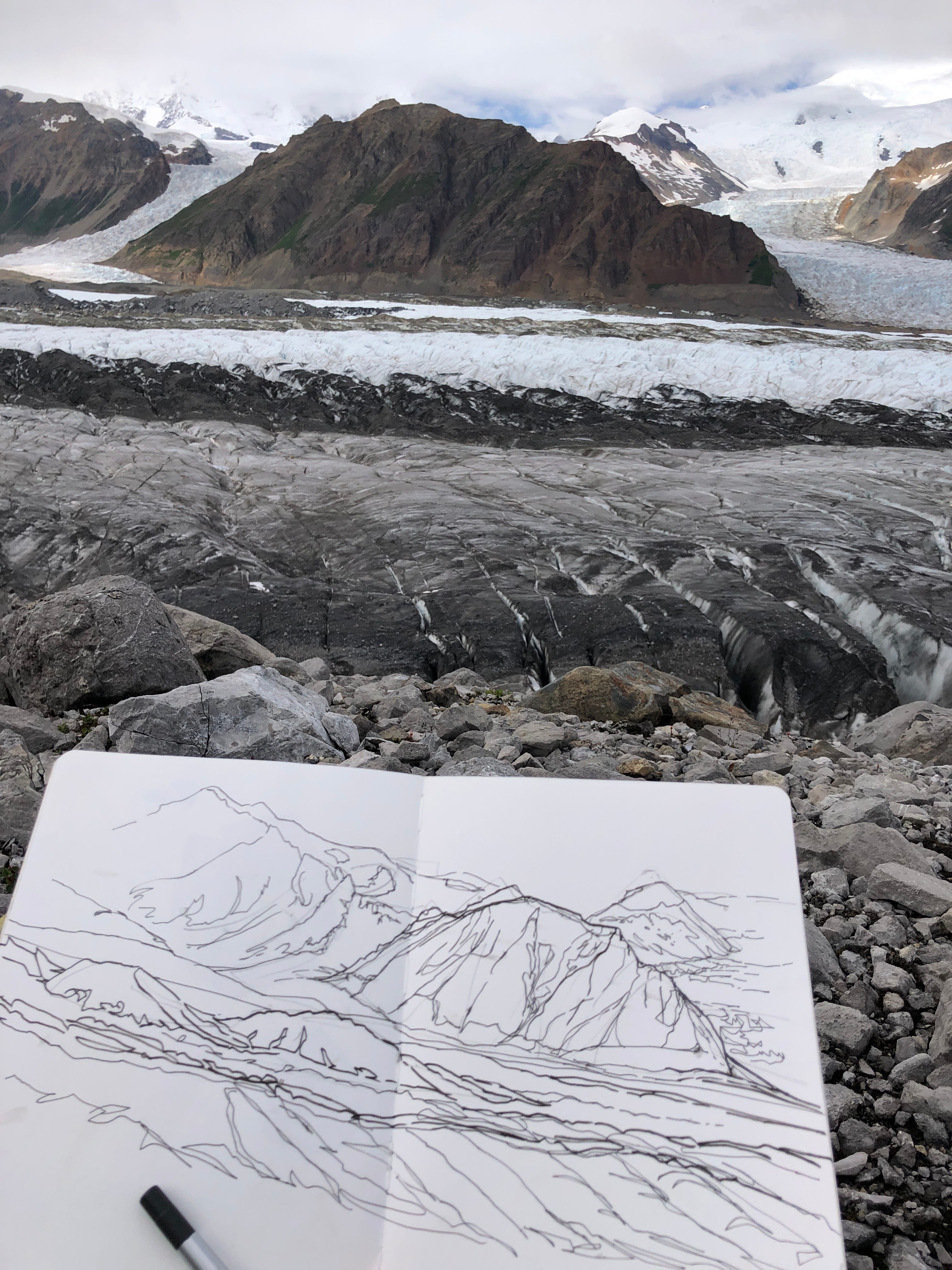 The first thing that I like to do is consider the view. What is important to capture? What is OK to generalize? I notice this landscape is all rock and some ice, there is pretty much no vegetation so I want to emphasize the variation in the rock color. I am most excited about the little rock towers on the ridges (gendarmes) and the way the mountains hold the shrinking glacier which cracks and spills over in places. I also think it is interesting to see the moraines and ridges showing the extent of the glacier when it was bigger. Zoom into the photo and see what is interesting to you.