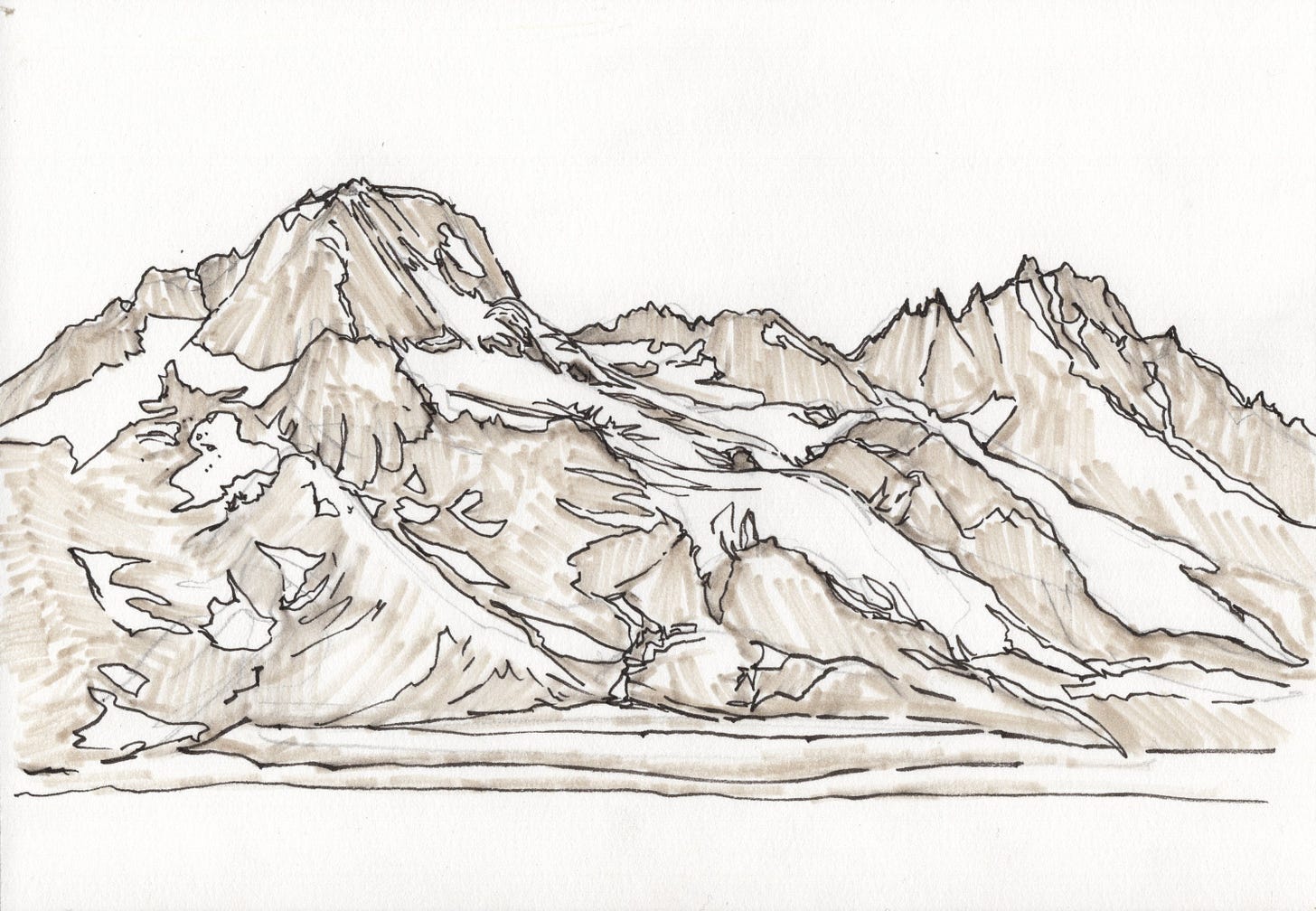 After I have my pen lines it feels a little bit confusing to figure out what is snow or ice and what is rock. Even when I’m not sketching glaciers I sometimes like to add in some value and shadows next. Here I used a gray pen to mark the rock in the landscape which makes the snow and ice more noticeable. I tried to make directional marks with the gray pen to show the structure of the rock.